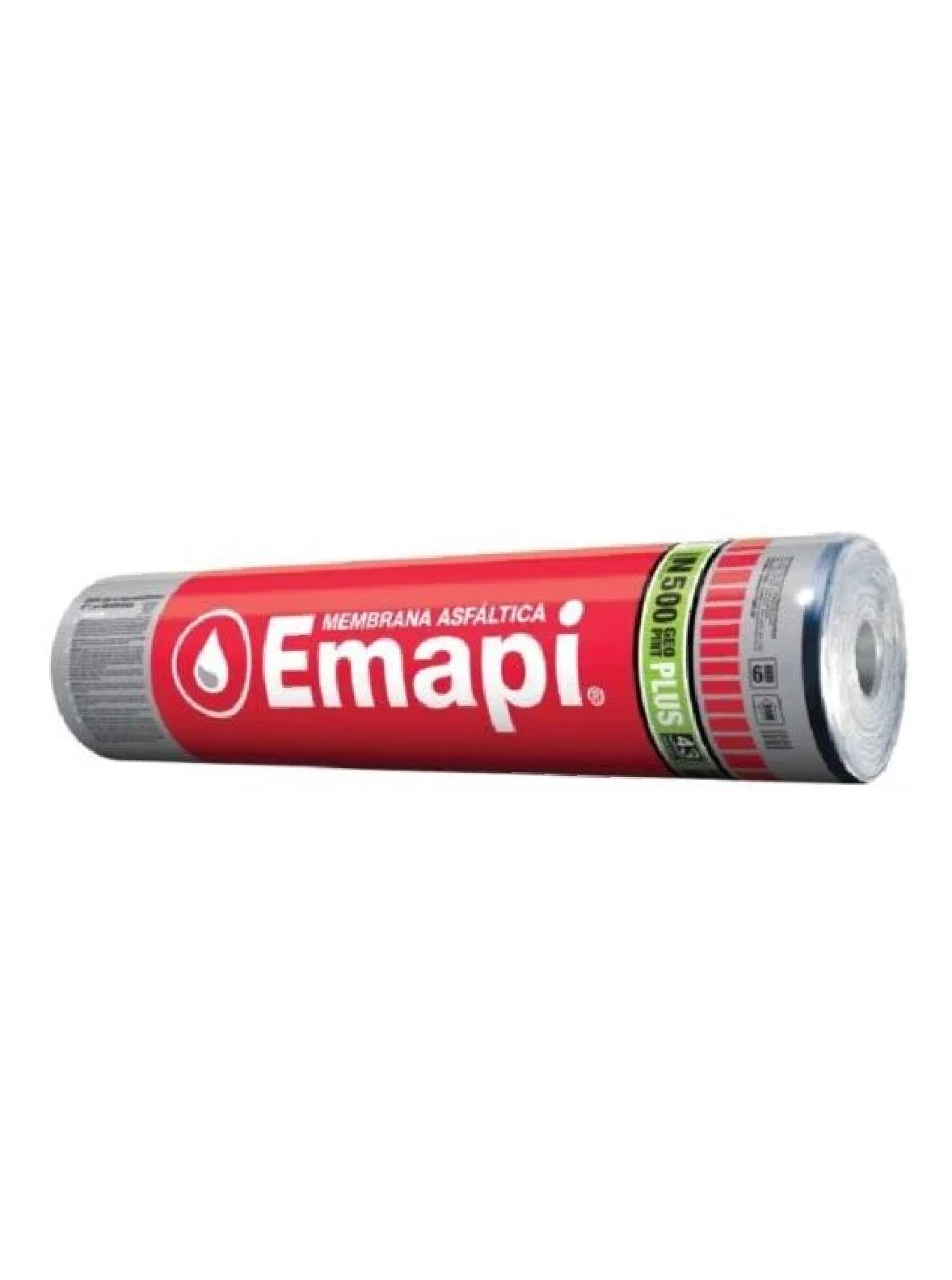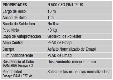 Las membranas EMAPI de la línea N 500 Geo Pint Plus, son desarrollos que combinan las excelentes propiedades impermeabilizantes de los asfaltos plásticos normalizados de EMAPI S.A. con los atributos del PEAD (polietileno de alta densidad) formulado y producido por la División Polímeros de EMAPI S.A., incorporado como alma central del producto y a su terminación inferior. El conjunto se encuentra protegido de sobreesfuerzos de tracción mecánica por una capa de geotextil de poliéster tejido no tejido termofijado de alto gramaje –de notable estabilidad dimensional– que garantiza las más exigentes solicitaciones en plegado, tracción, flexión y punzonado; a la que deberá aplicarse como terminación, Emacril –impermeabilizante acrílico para techos.